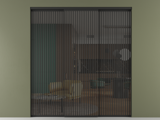 Во всех алюминиевых перегородках, независимо от типа установки, используется компланарный раздвижной механизм, благодаря которому декоративная крышка и полотно находятся в одной плоскости.