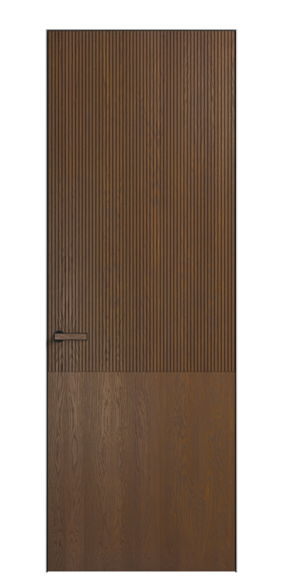 Это полотна с рельефной фрезеровкой. Этот прием делает интерьер объемным, тактильным, вносит интересную текстуру и создает современный образ. Волнистый рельеф может быть выполнен по ламелям из массива дуба в древесных матовых отделках, либо исполнен по натуральному и экологически безопасному материалу — ХДФ, покрытому гладкой эмалью актуальных оттенков.